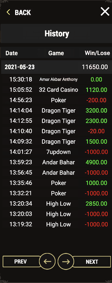 Betting history menu returns the list of all stakes made in all of the casino games.