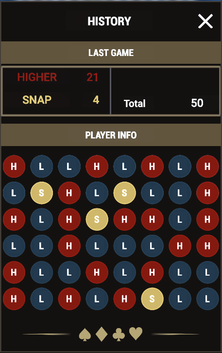 The objective of Hi-Low is to predict the winning card of the game round. It is played with six card decks that are stored in a shuffling machine. To win, you need to predict if the next card will be higher, lower, or of the same value as the base card of the round. You can also choose to bet on other betting positions on the table.