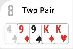 Two Pair - Any two cards of the same rank together with another two cards of the same rank. If several Positions have a Two pair Hand, the Hand with the higher pairs wins. If two players have the same rank pairs, the Hand with the higher kicker wins.