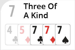 Three of a kind- Any three cards of the same rank. If several Hands have Three of a kind, the Hand with the higher Three of a kind wins. If two Hands have the same Three of a kind, the Hand with the higher fourth or/and fifth card wins.