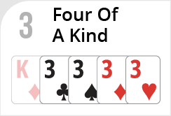 Four of a kind- Any four cards of the same rank. If several Hands have Four of a kind, the Hand with the higher Four of a kind wins. If several Hands have the same Four of a kind, the Hand with a higher kicker wins.